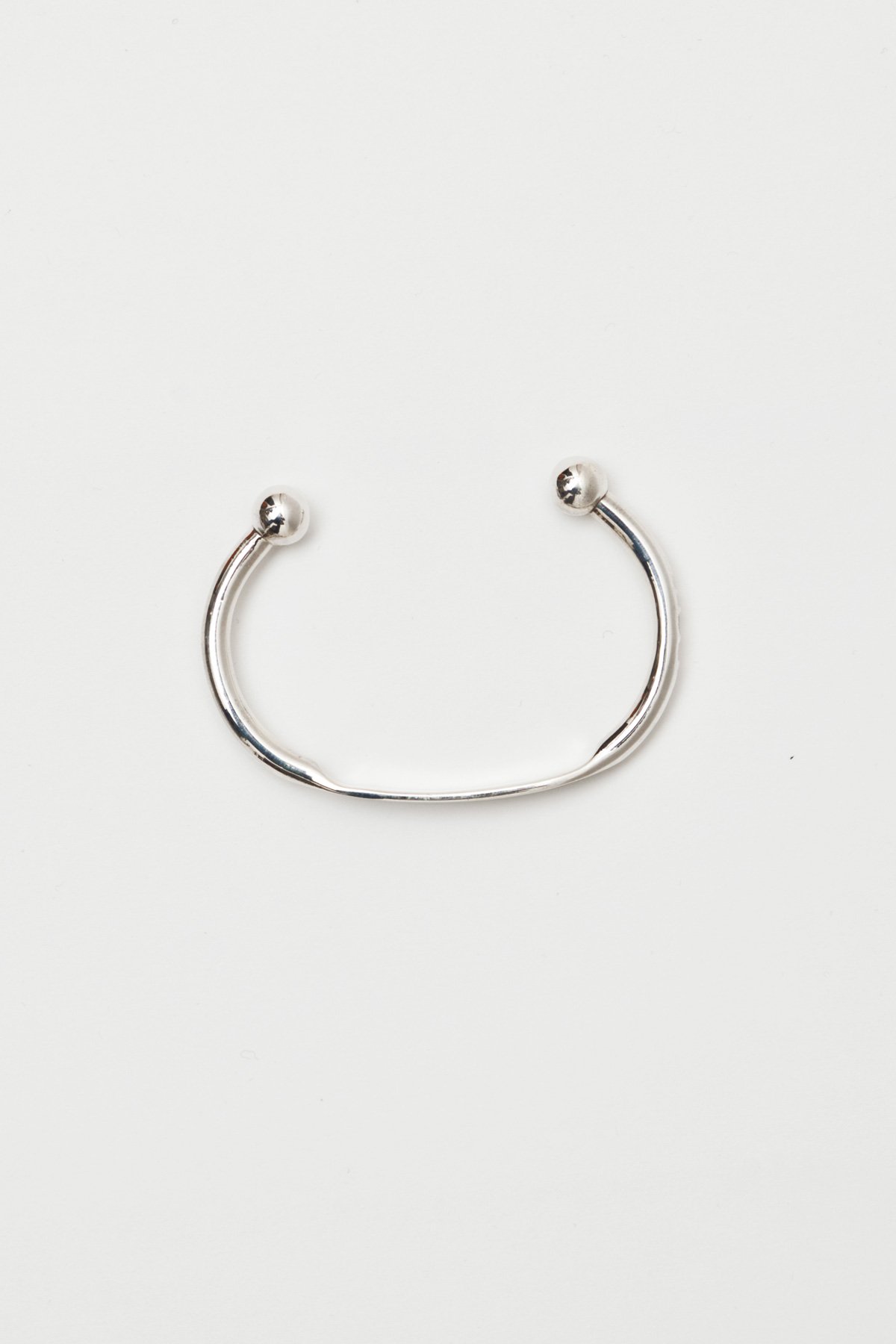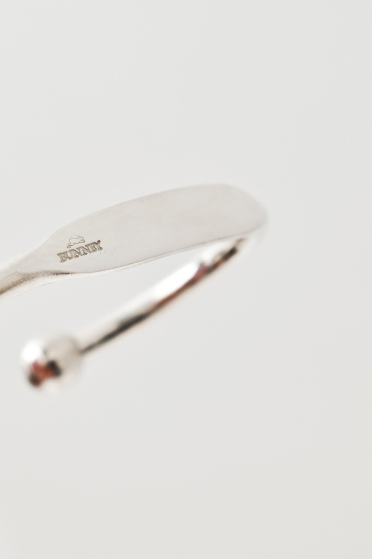 Torque silver identity bangle from Bunney. Made in England from 925 sterling silver. Hand finished before being hallmarked at the Goldsmiths’ Company. Polished finish with small engraved logo on the front. Comes with a impregnated satin weave pouch for polishing and storage. Measures 7,5 x 5 centimeters. Made in England.
