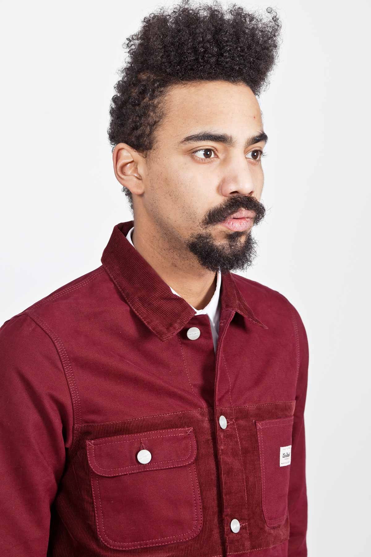 Cotton bordeaux Rey coat from Carhartt. Part of the Work in Progress line. Made from premium cotton canvas. Corduroy top collar and chest overlay panel. Unlined. Metal button front closure. Two chest pockets and two rounded front pockets. Buttoned cuffs. 100% Cotton. Model is 189 cm and wears size Medium.