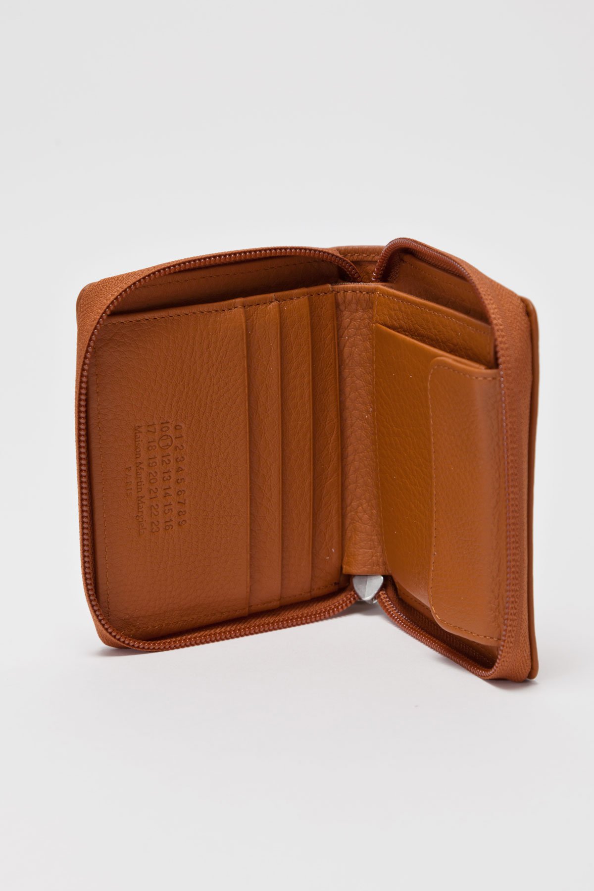 Wallet from line 11 of Maison Martin Margiela. Made in Italy from premium leather. Zipped open on three sides. Several inner compartments. Bill compartment and coin pocket with press button. Embossed logo on one inner side. Signature stitching on the outer side. Made from 100% Leather in Italy. Measures 10,5 x 11,5 x 2 centimetres.